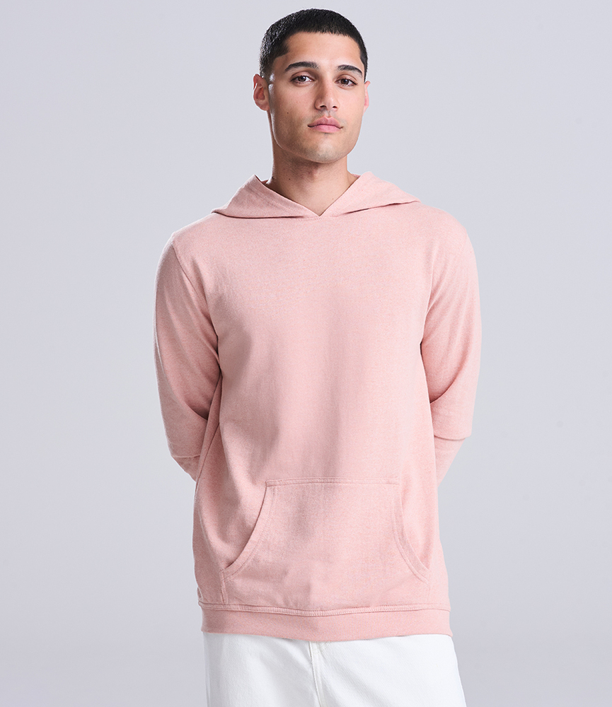 70% recycled cotton/30% recycled polyester. French terry.Drop shoulder style.Fashion fit.Hood with no drawcord.Taped neck.Front pouch pocket.Ribbed angled cuffs and hem.Unbranded size label at neckline.Recycled cotton is made from 100% pre-consumer waste.