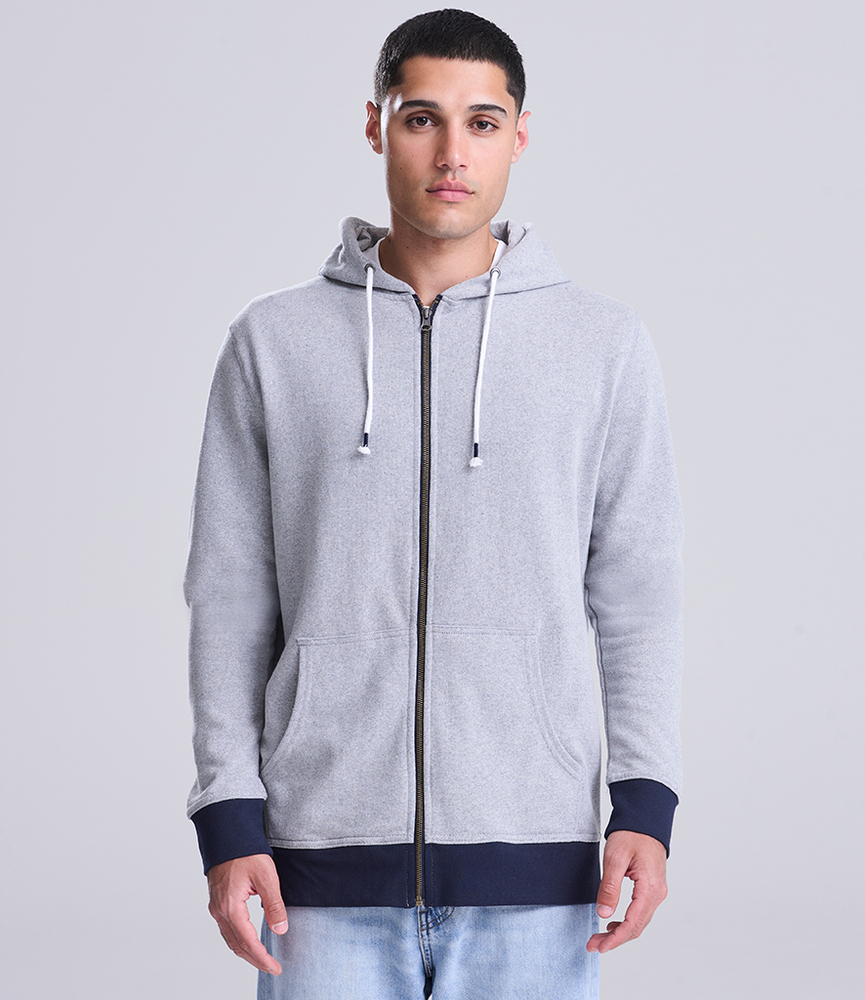 70% recycled cotton/30% recycled polyester. Peached finish.Brushed back fleece.Drop shoulder style.Hood with contrast drawcord.Taped neck.Full length metal zip.Front pouch pockets.Contrast ribbed cuffs and hem.Unbranded size label at neckline.Recycled cotton is made from 100% pre-consumer waste.