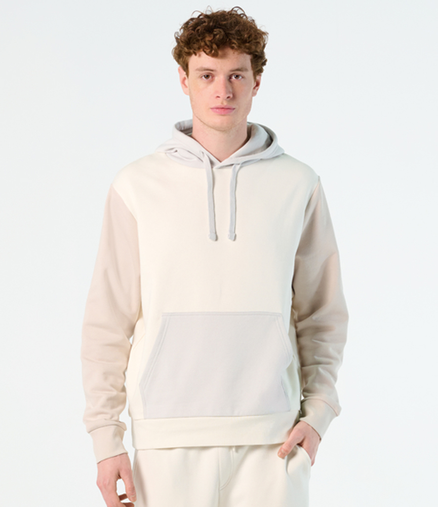 80% organic combed cotton/20% recycled polyester. Organic or in-conversion to organic cotton.Brushed back fleece.Drop shoulder style.Lined hood with chunky drawcord.Taped neck.Locker patch.1x1 ribbed cuffs and hem.Front pouch pocket.Unbranded size label at neckline.