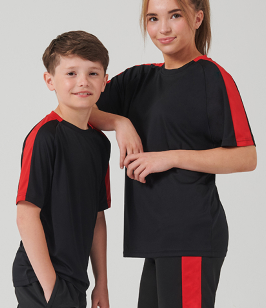 100% polyester. Single jersey. Wicking finish keeps you dry and comfortable. Raglan sleeves. Contrast back collar, shoulder and sleeve panels. Twin needle cuffs and hem. Tear out label.