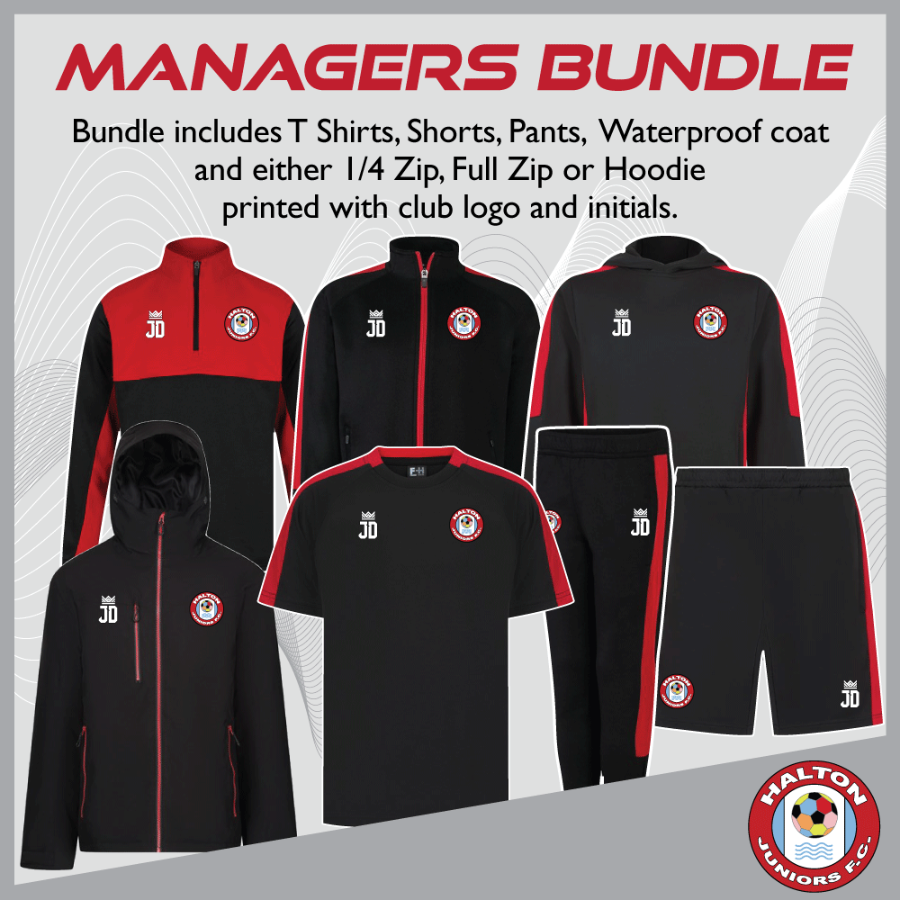 Our managers bundle come with the following items and the price includes printed club badge and your initials. please leave your intials in the box provided also we recommend getting a size down in shorts from the pants size these seem to fit better. just order your normal size for clothing as these are true to size.